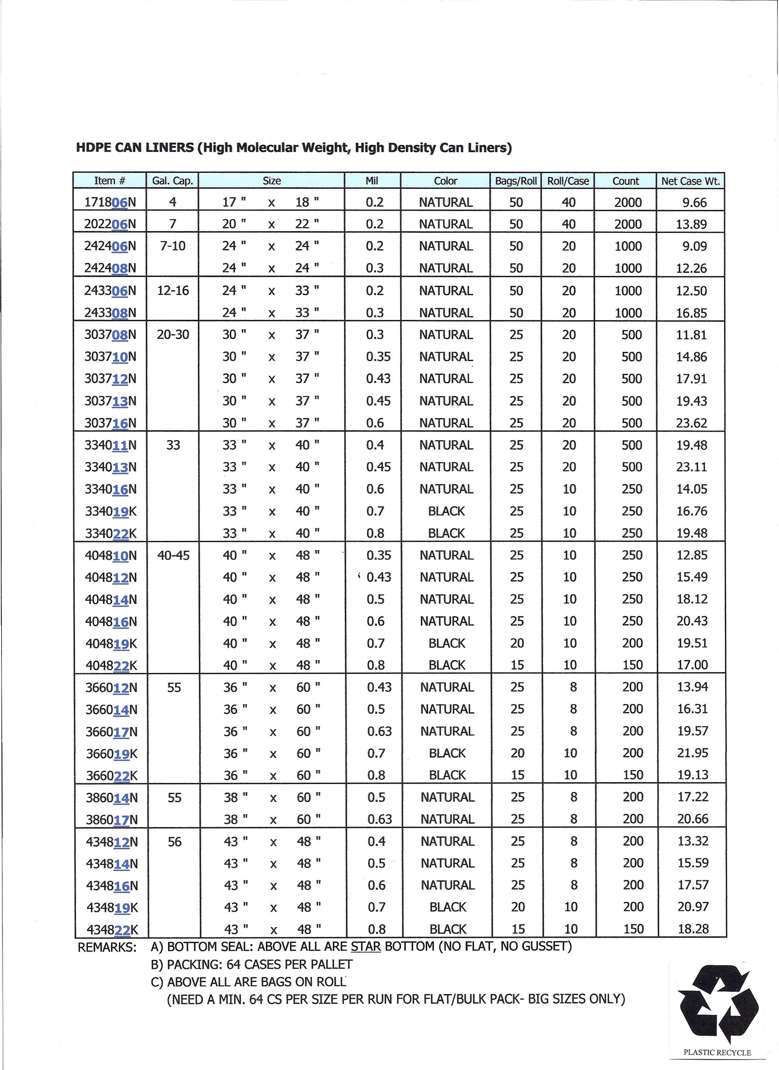 Feature a unique blend resins for superior puncture resistance and superior tear strength. Eliminates problems experienced with other high density bags